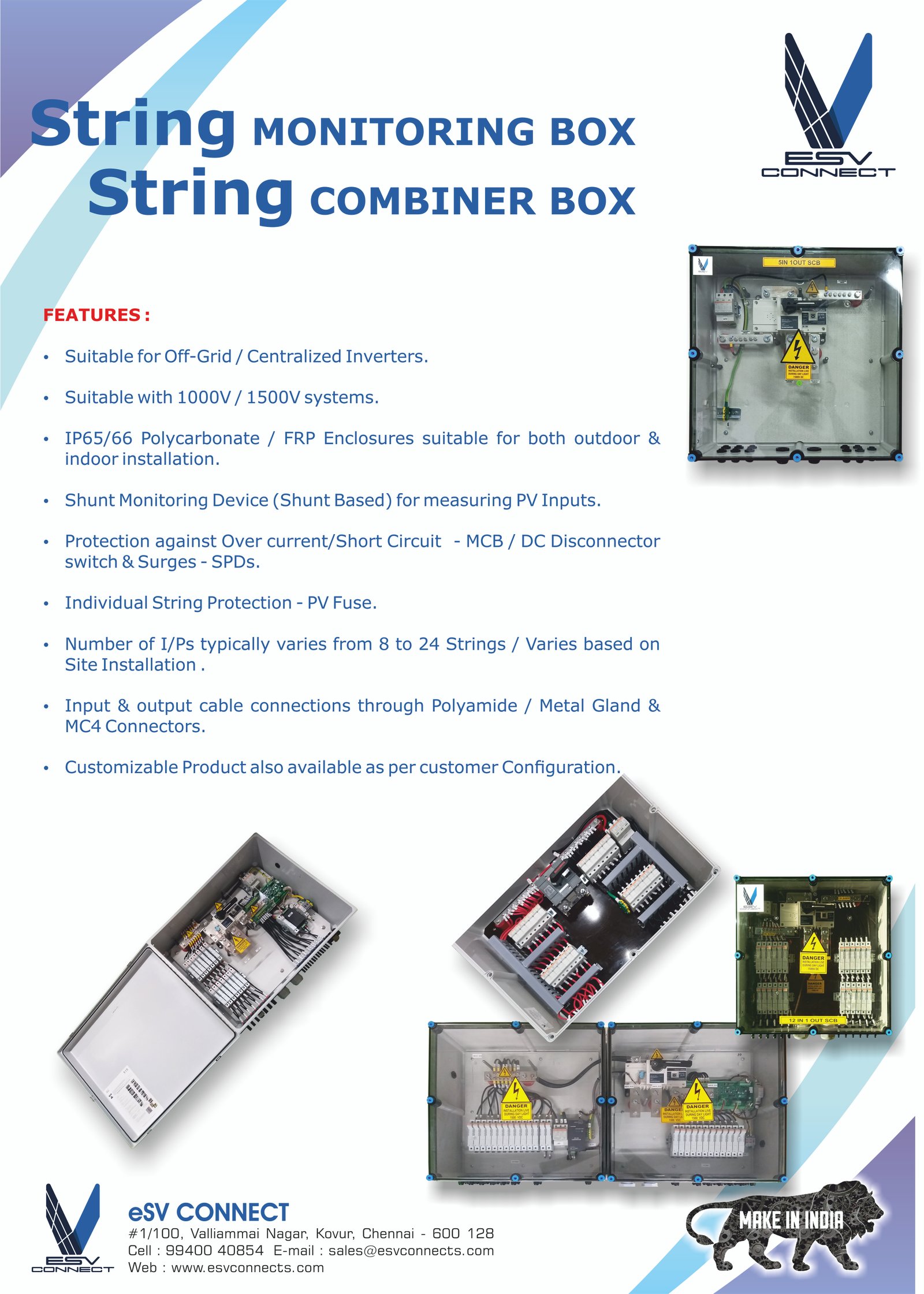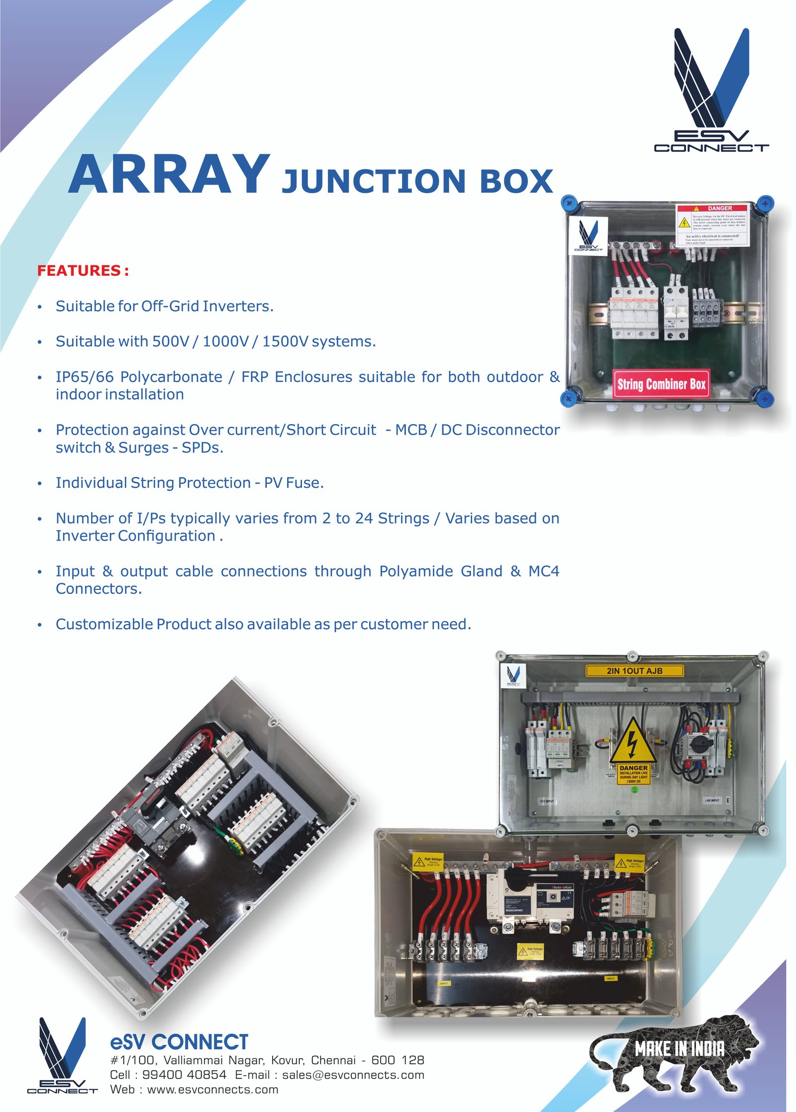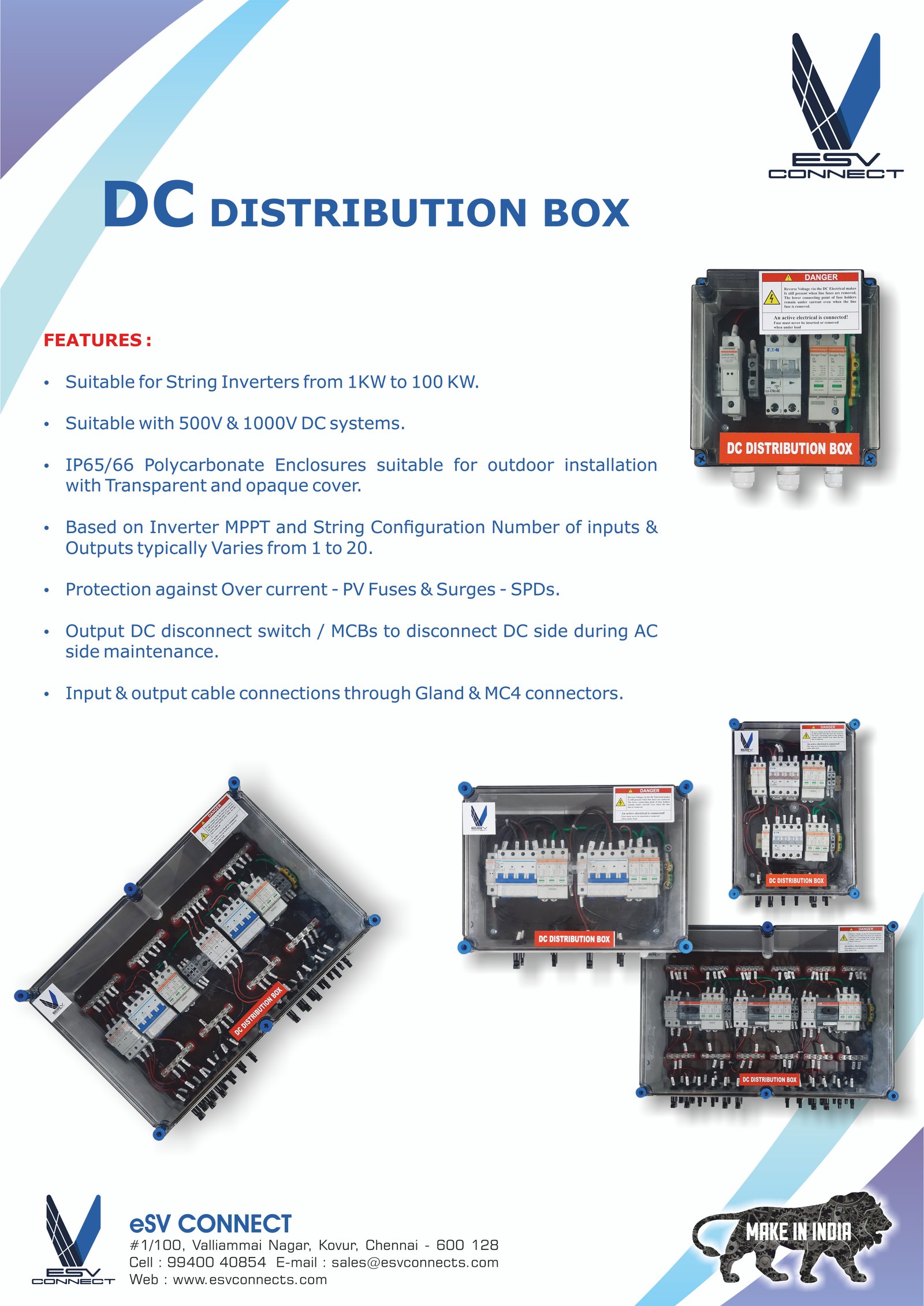 eSV Connect offers array junction DC distribution boxes (DCDB), AC distribution boxes (ACDB), Array Combiner boxes (AJB) and string monitoring boxes for solar PV applications and are designed to meet international electrical standards. These boxes provide interconnection between input leads from the solar module arrays and the output leads to the inverter.